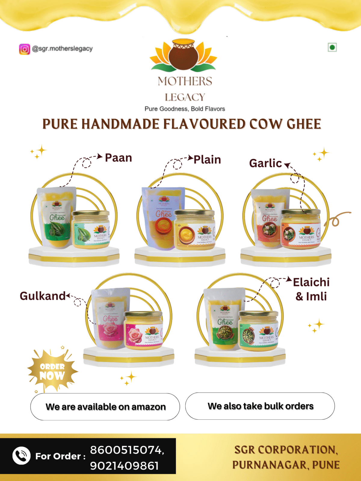 Founder of mother's legacy. Presents flavours in cow ghee like elichi, gulkand, garlic , pan , without flavour plain ghee